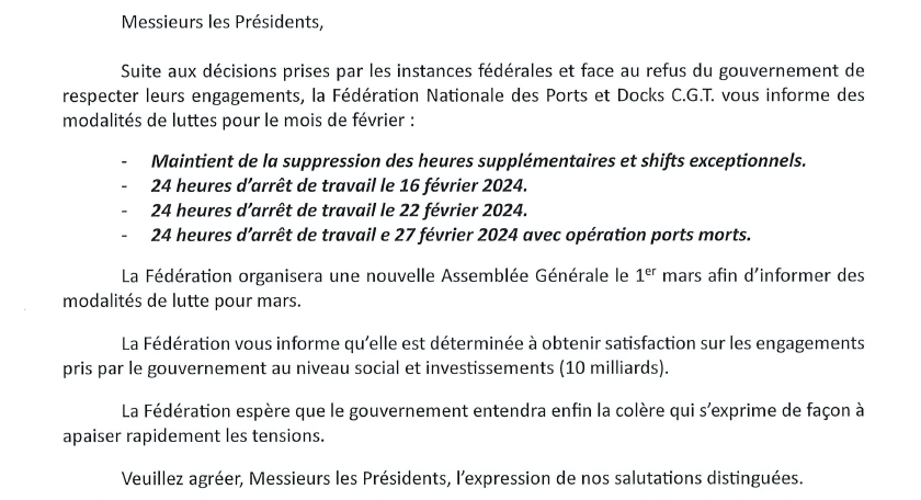 Vous trouverez ci-dessous un extrait du courrier de la fédération National des Ports et Docks :