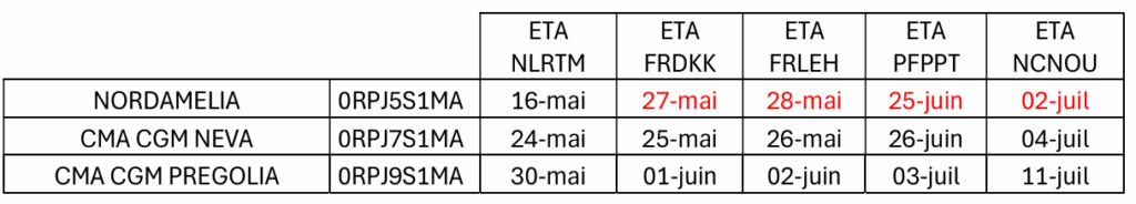 Afin d’éviter d’accroitre potentiellement le retard pour vos bookings pris au titre du NORDAMELIA nous vous encourageons à les déplacer vers le CMA CGM NEVA 0RPJ7S1MA.